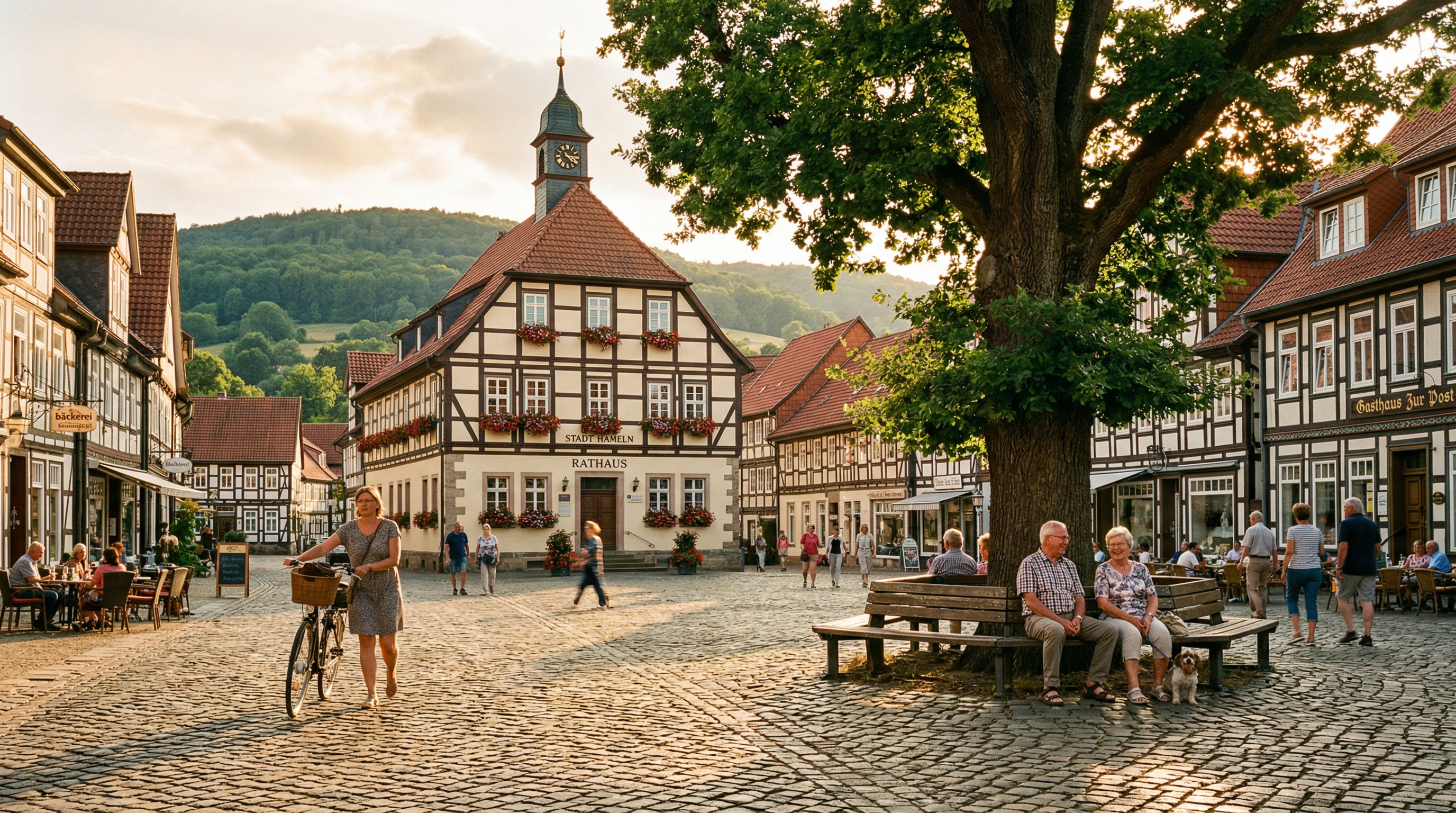 Mittwochs Wochenmarkt auf dem Rathausplatz, Radtouren entlang der Weser, Feierabend im „Alten Krug". 20 Minuten nach Holzminden, 40 nach Hameln – und trotzdem alles vor der Tür, was man braucht.